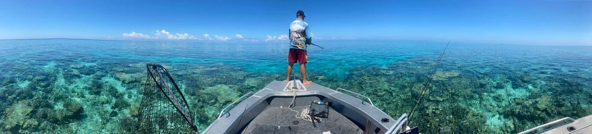 Once at the Great Barrier Reef, reef edges produce coral trout and red throat emperor in numbers and trolling high-speed spreads produce Spanish mackerel in numbers. Popping and stickbaiting pressure points is popular amongst giant trevally anglers. Square Reef (north), Stevens Reefs (from Mackay) and Chauvel Reefs (from Sarina) are all popular anchorages to use as bases.